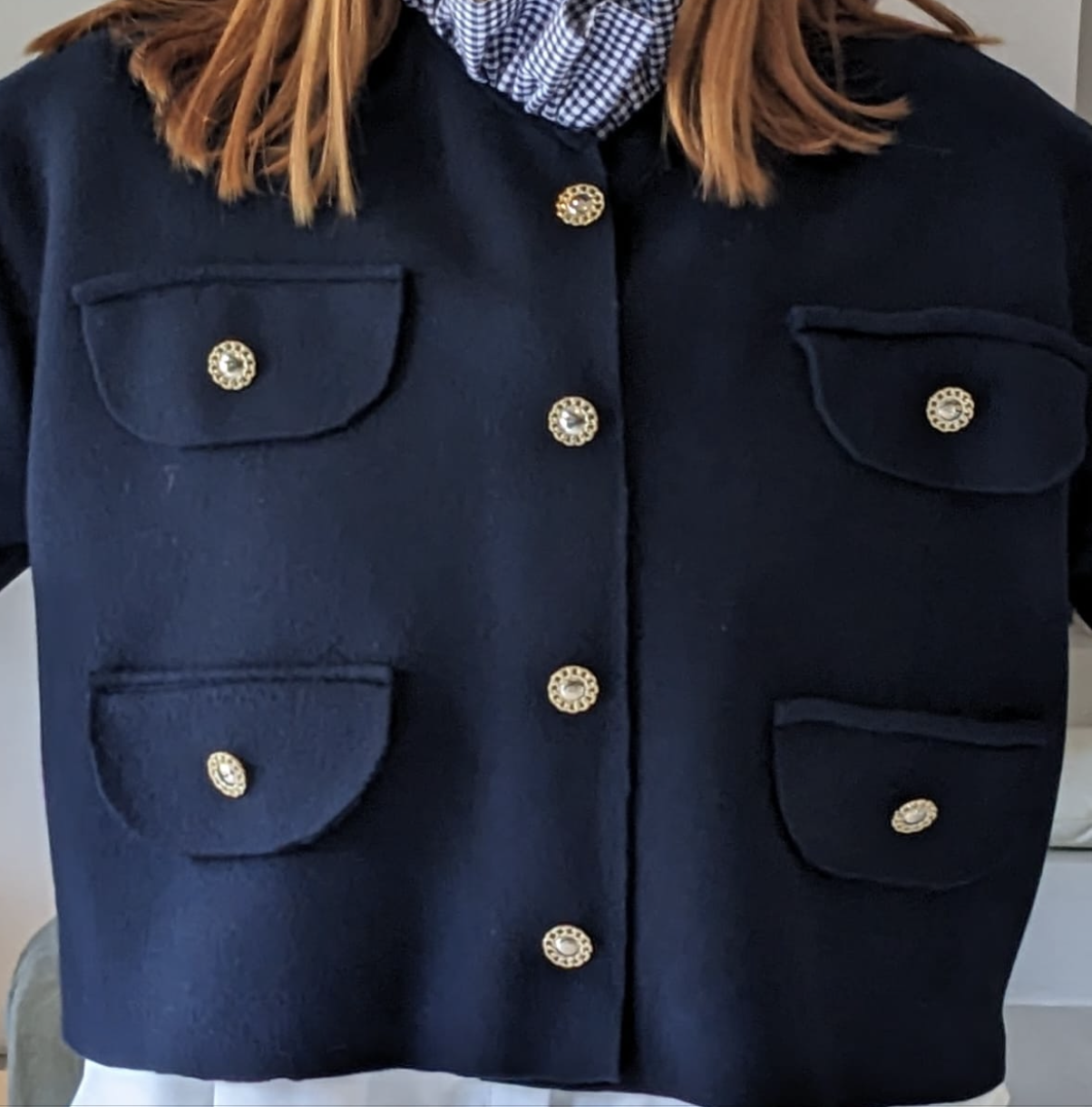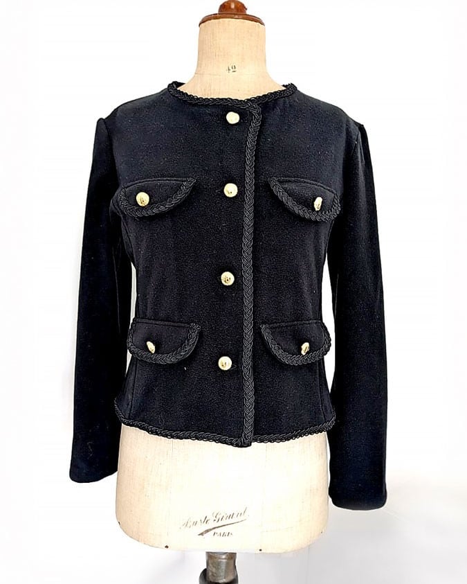La ‘Veste 23’ existe en XS, S, M et L. En polaire noire ou bleue et boutons dorés.